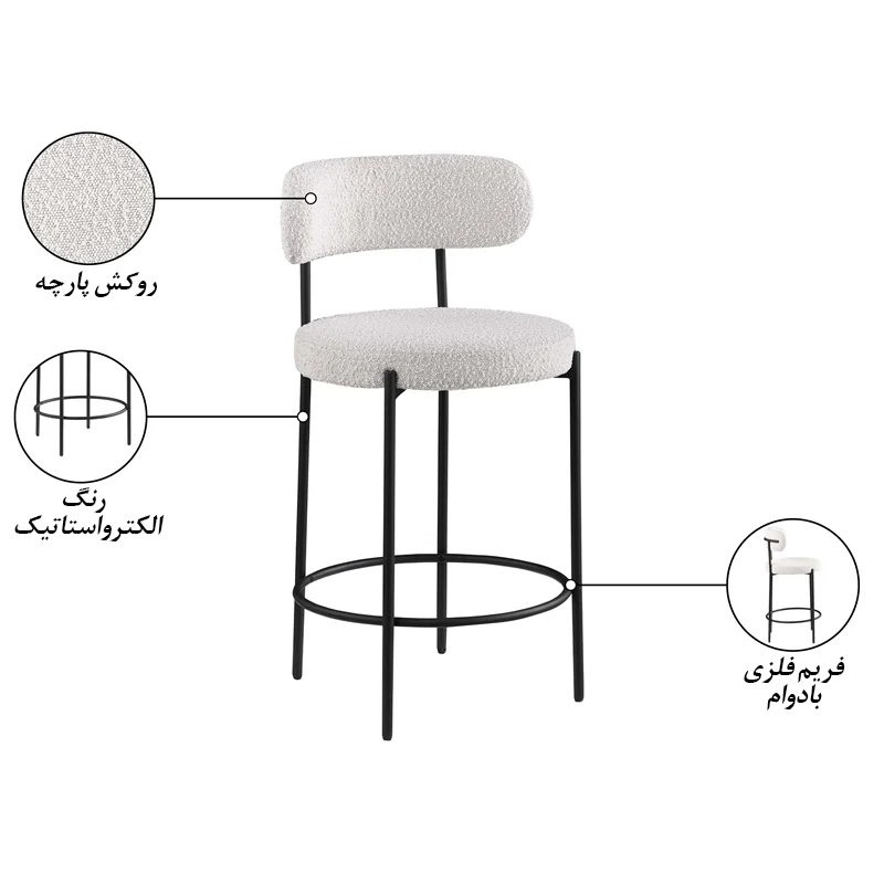 پایههای فلزی مستحکم، ساخته شده از فولاد با پوشش رنگ الکترواستاتیک ضد زنگ، از ویژگیهای برجسته این صندلی هستند. نشیمنگاه و پشتی با متریال باکیفیت، روکش پارچهای مقاوم در برابر سایش و لکه، دوام بالایی دارند. طراحی ارگونومیک پشتی و نشیمنگاه، مطابق با انحنای بدن است که برای جلوگیری از خستگی در استفاده طولانیمدت بسیار مناسب است. ارتفاع مناسب صندلی، ایدهآل برای استفاده در کنار کانترها و میزهای بلند است.