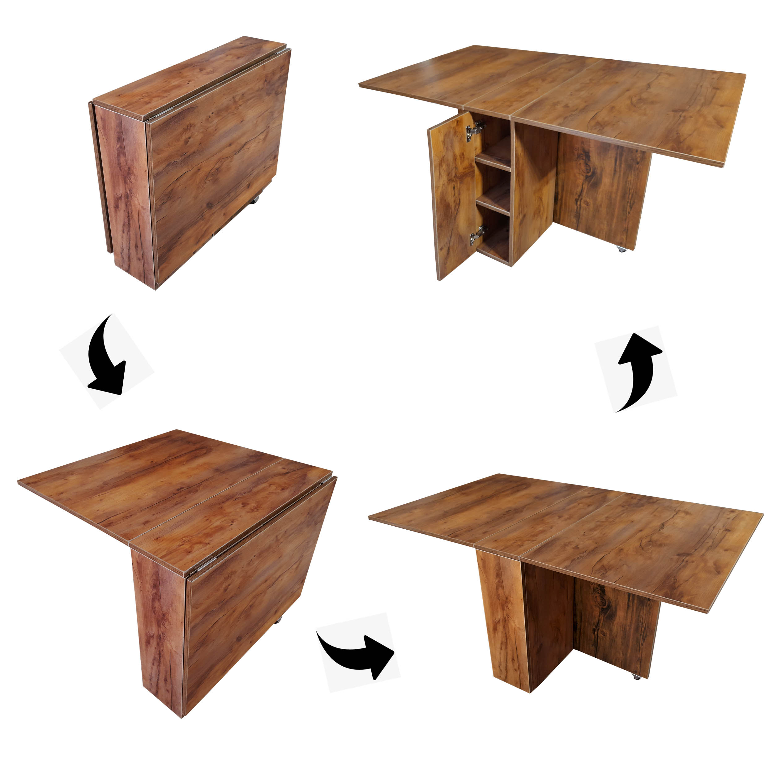 میزهای تاشو از جمله تجهیزات بسیار پر طرفدار و محبوب در بین اکثر افراد و خانه ها محسوب میشوند دلیل آن هم این است که علاوه بر باز گذاشتن دست صاحب خانه در نوع چیدمان منزل ، به خاطر خاصیت جمع شوندگی آن پس از استفاده میتوان آن را جمع ، و به گوشه ای هدایت نمود. بنابراین میتوان از فضای منزل که معمولا خانواده ها با کمبود آن مواجه هستند بهترین استفاده ممکن را برد و به همین دلیل میز های تاشو به عنوان یک ترفند هوشمندانه، برای مدیریت فضای منزل قلمداد شده و قابلیت بسیار بالایی را در سازگاری با فضاهای کم از خود نشان می دهند. محصول فوق جزء میزهای مدرن بوده و در زیر آن دارای چرخهایست که علاوه بر اینکه دارای استحکام و ثبات مناسب است جابجایی آن را بسیار تسهیل کرده است ، این میز طی دو مرحله کاملا باز شده که هم میتوان در حالت نیمه باز و یا در صورت نیاز تمام باز از آن استفاده نمود.که درحالت تمام باز میتوان از آن به عنوان یک میز نهار خوری 4 تا 6 نفره و یا در صورت نیاز میتوان به عنوان یک میز تحریر بزرگ که به راحتی قابل استفاده برای 4 تا 6 نفر است از آن بهره برد که علاوه بر منازل برای محیط هایی نظیر کتاب خانه ها و مهدی کودک ها که نیاز به فضای زیادی برای فعالیت بچه ها هستند می تواند گزینه فوق العاده ای محسوب گردد.